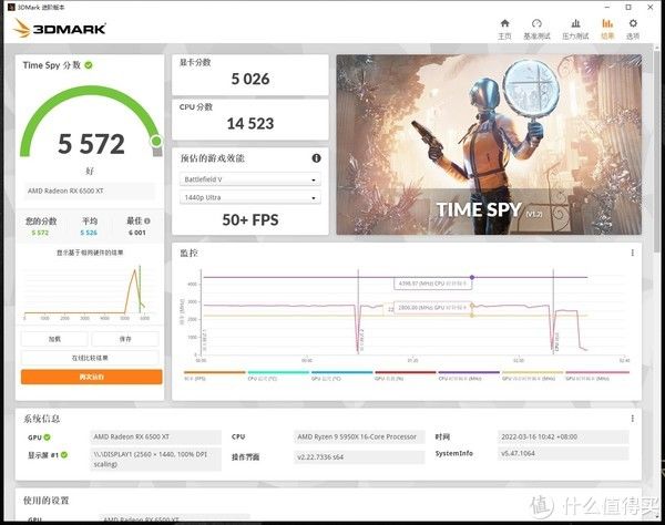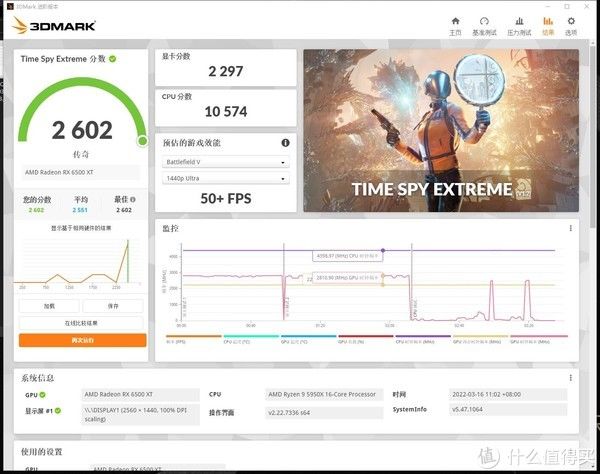 在DX12的TIME SPY和DX11时差不多,2K下time spy分数为5572,图形得分5026,4K下time spy extreme总分2602,图形得分2297;至于光追Port Royal的,RX6500XT理论上是支持光追,但你懂我意思的。