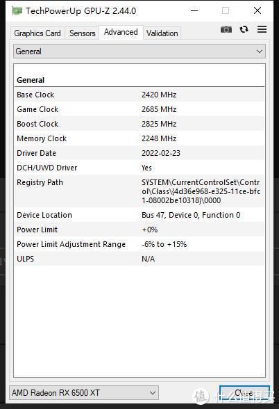 在GPUZ截图界面中,RX6500XT黑狼的默认核心频率为2685Mhz/2825Mhz,相比AMD官方的2610Mhz/2815Mhz要高一点,属于小幅度超频版本;而显卡BIOS信息现实功耗限制可以+15%调整,当然考虑到本身默认频率已经相当高了,功耗限制反而未必是重点。