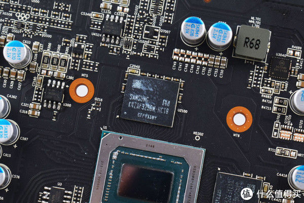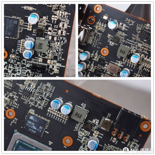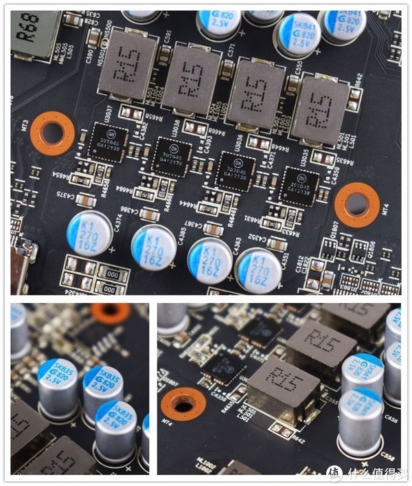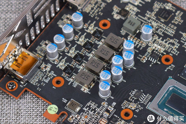 在供电元件用料方面,核心和显存部分非常相近,其中核心部分4相供电使用固态电容+R15贴片电感+NCP MOS组合,其中NCP来自安森美,工作规格为45A;而显存部分3相在电感方面更换为R68贴片电感,其他和核心部分保持一致。