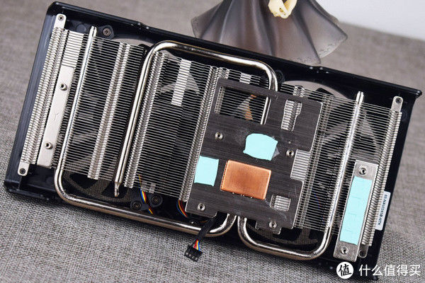 在散热器方面,RX6500XT黑狼的散热主体使用纯铜焊接底座+2条U型6mm镀镍热管+焊接工艺+大面积散热片设计,搭配双风扇散热属于比较老学校的设计;在显存和核心供电mos的散热均为底座+导热垫。