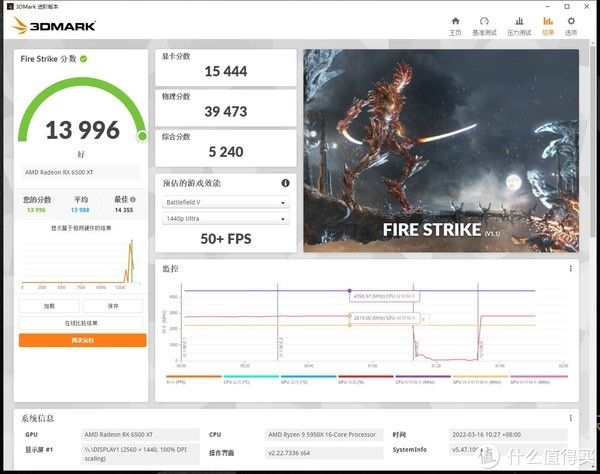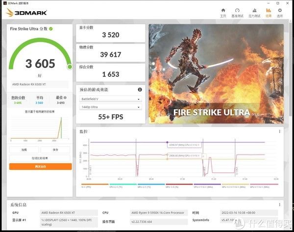 来到3DMARK基准测试部分中,RX6500XT黑狼的Firestrike表现还算不错,总分达到,其中图形得分为,;而2K和4K的Extreme和ULTRA就不怎么理想了,图形分部分只有6768/3520分;可以进一步印证它面向1080P的产品定位。