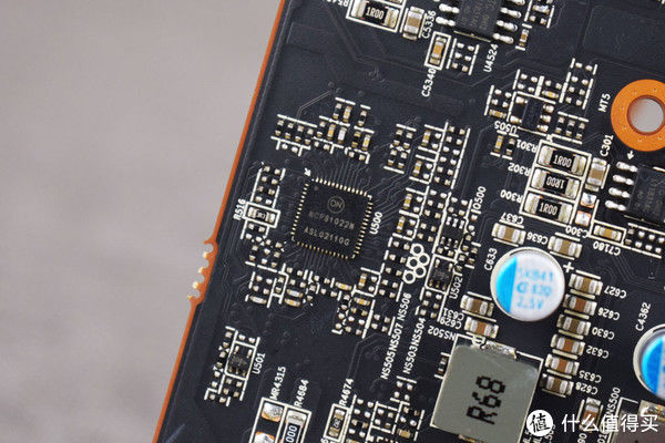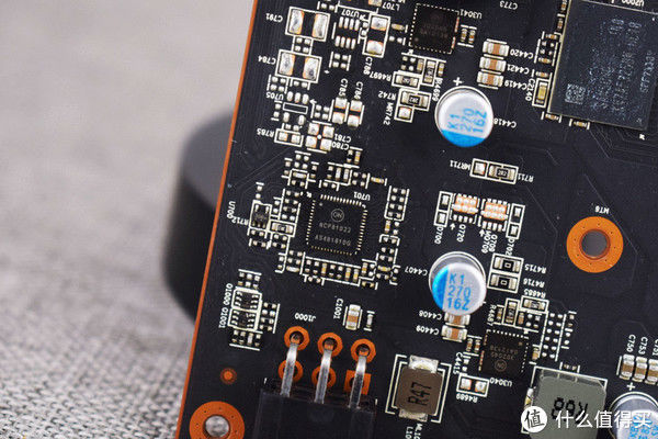 在显卡供电部分,RX6500XT黑狼使用双PWM芯片方案,供电MOS部分均使用Drmos,其中安森美NCPN控制GPU核心的4相供电,安森美NCP则控制显存的3相供电,应对低温低功耗的RX6500XT反而感觉有点堆料。