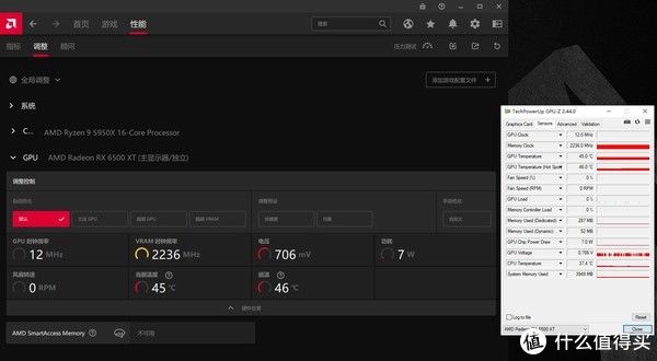 从上述测试中可以看到,RX6500XT这款芯片的功耗较低温度也很理想并且有一定功耗限制调整空间,在超频空间上应该有更好表现吧?所以管家在控制面板中尝试全部拉满,结果直接黑了;在反复调整后核心频率固定在2.9Ghz,之后就再也很难往上走了。